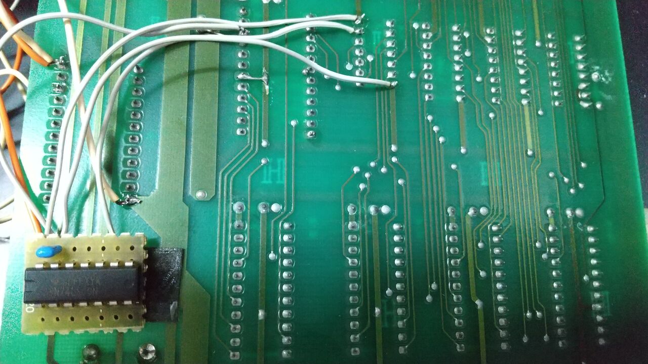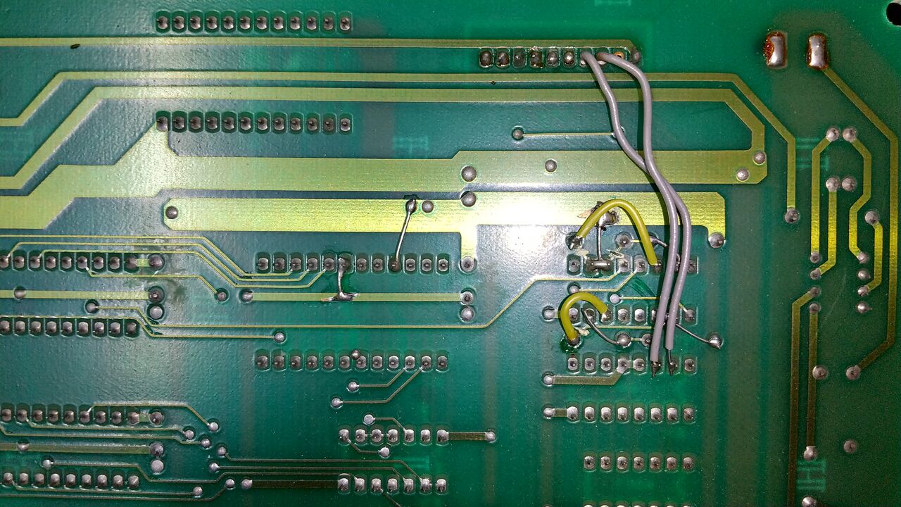 Z80A近辺にMB81416(16Kx4bit DRAM)の空きパターン。スルーホールのハンダを抜く。