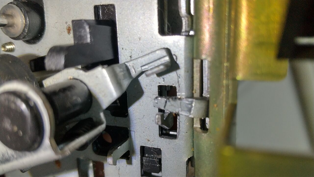 金具の歪具合からみて、カセットのフタを開けた状態で無理やり閉めるか落としたか、そのようなことで壊れてしまったようだ。逆に考えるとEJECTボタンでフタがきちんと開かないものはここが疑わしいということでしょう。