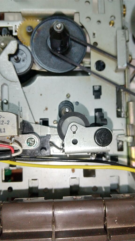 ベルトは交換したけど現象は変わらず。分解した状態で観察したらキャプスタンとピンチローラーの間が滑っている。ここが密着していないとテープは正常に走行しない。まずピンチローラーをアルコールで清掃。