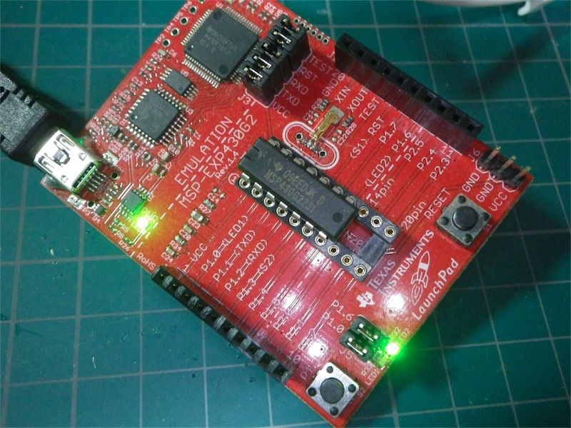 追記:LaunchPad v1.4、MSP430G2553に差し替えてもOKだった。基板上はTxD、RxDのショートプラグを外す。Energia IDEはLaunchPad G2553を選択。