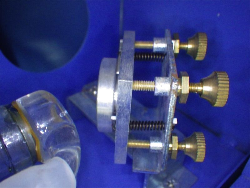 ネジは3点で留めてある。かなり固いのでラジオペンチで回す。動かしすぎてレーザー光をあらぬ方向に飛ばすとたいへん危険なので、1/4〜1/8ずつ動かしてレーザーを打ち確認する。