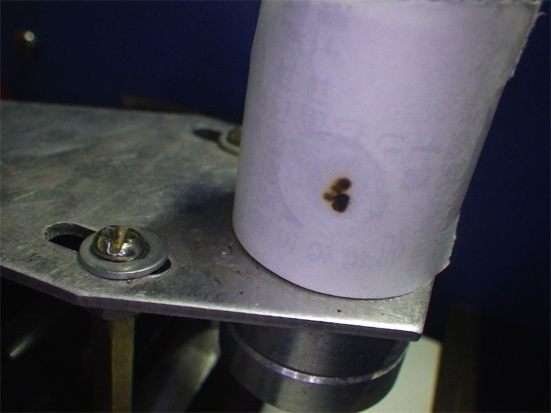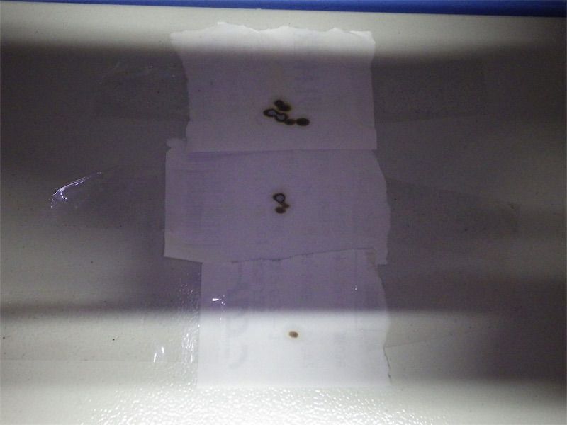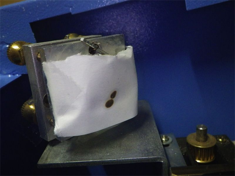 Cミラーへのレーザーの当たり具合を確認する。レシートの紙などをちぎってセロハンテープで留める。100V 8%程度でテスト発光。いちばん左上に寄せた状態と右下に寄せた状態で比較。かなりずれている。