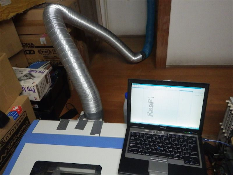 ダンボールの加工時に排気をいい加減にしてたので焦げ臭くなってしまった。アクリル加工などをする時にはこれではよろしくないのでダクトを延長して屋外に排気するようにした。アルミ製の排気ダクトは直径10cmのもので約700円。継手も合わせて1000円くらい。