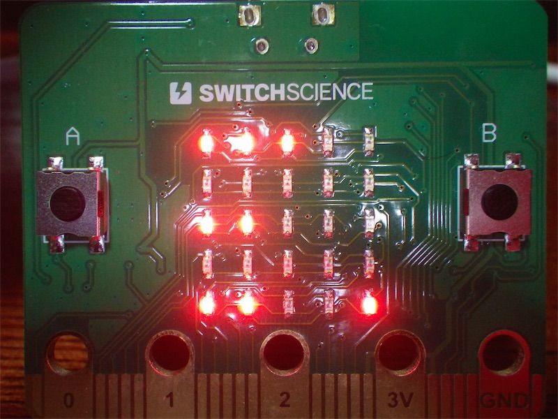 何も表示しないと動いているかどうかわからないので、空いている場所でLEDを点滅させることにした。これはforeverループ内でチカチカさせておく。これはボタン操作とは無関係。
