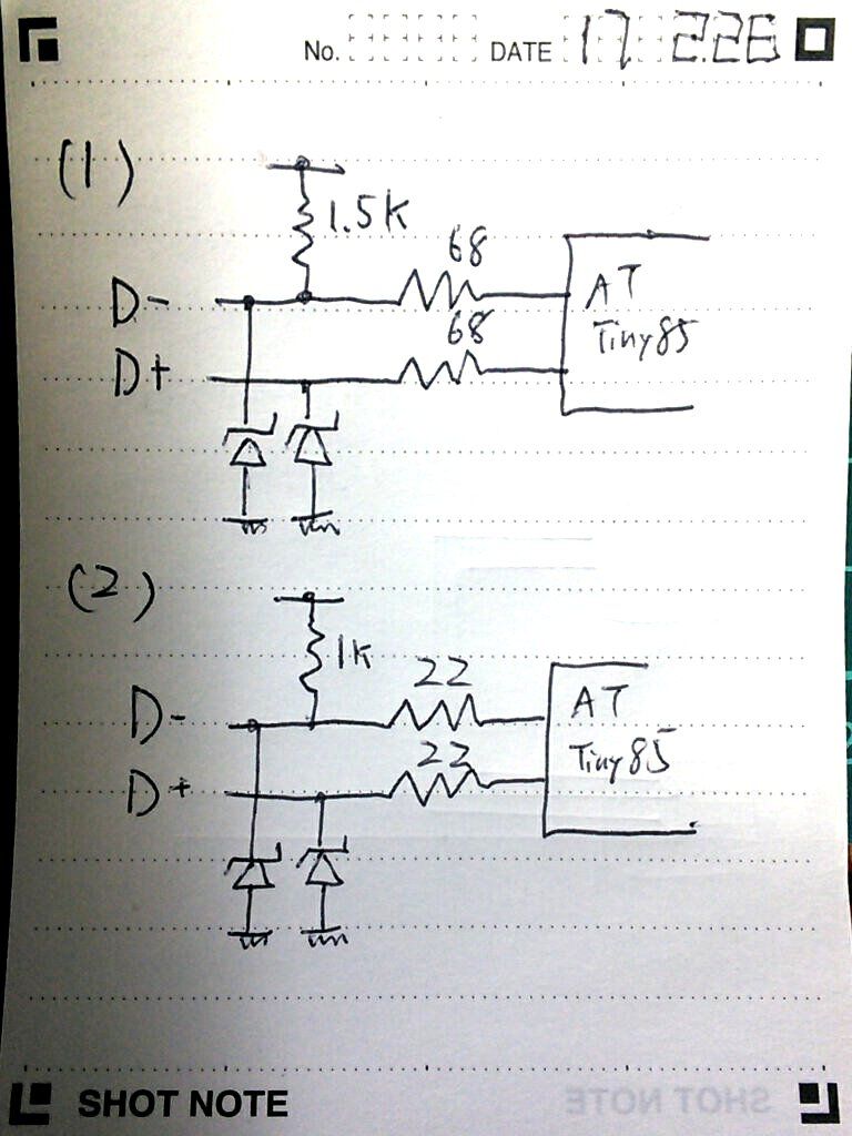 (1)がオリジナルと同じ。(2)はOLIMEX製の互換ボードと同じ。このあたりはDigisparkが採用しているV-USBを見るとよい。