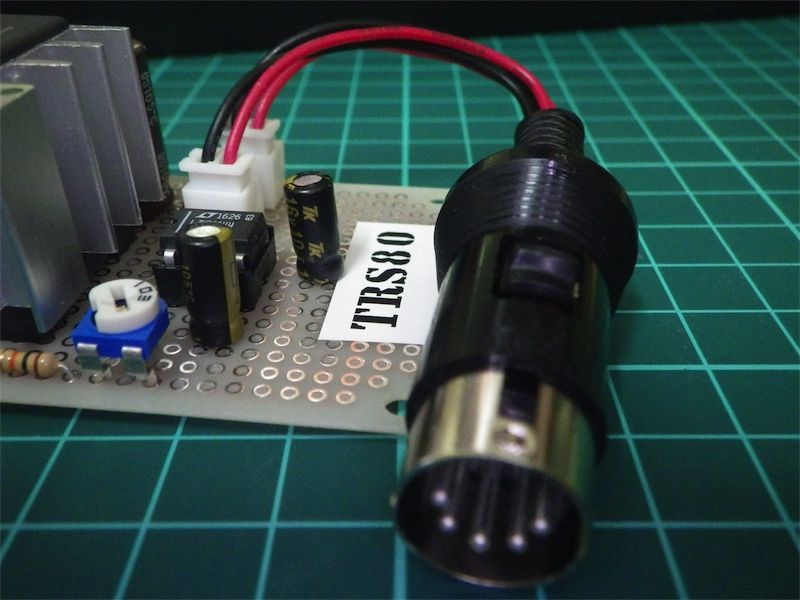 ディスプレイを繋がなくてもTRS-80の[英数/カナ]キーを押すことでキーボード上のLEDが赤/青とトグルするので動作していることが確認できる。これで本体無改造で電源を作ることができた。