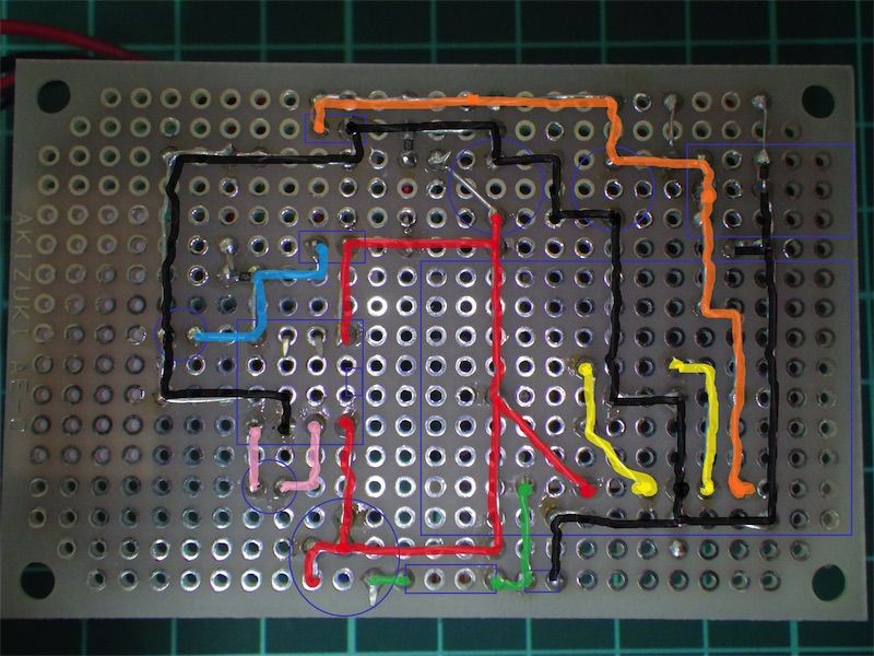 最終的に以下のような実装になった。各所にあるLEDは動作確認用で、4.7kΩを直列につないでいる。