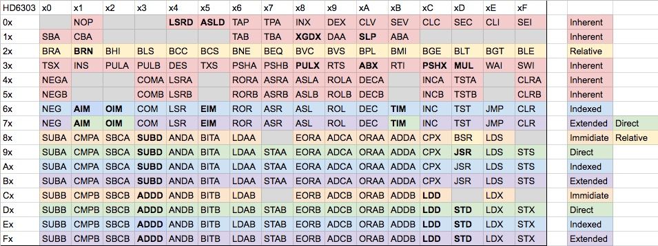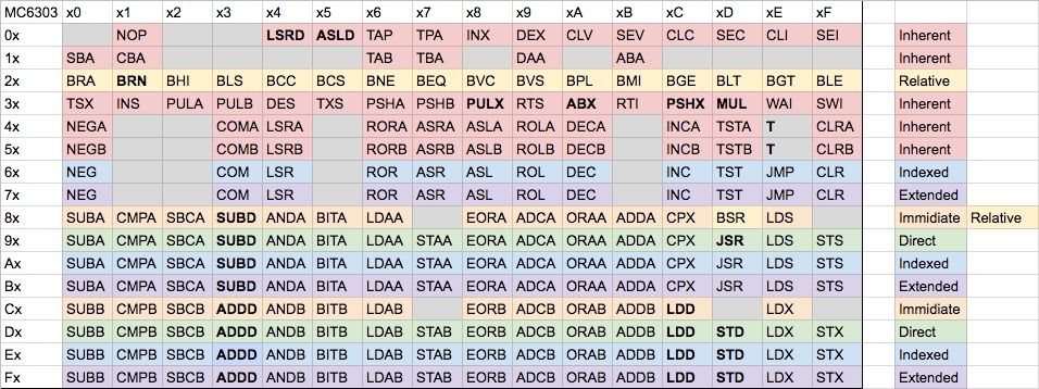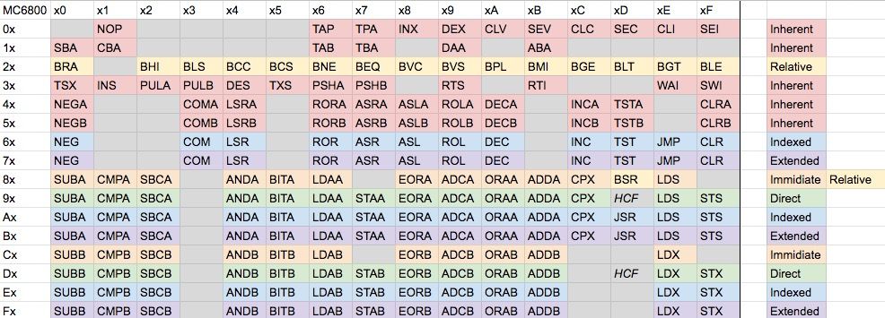 MC6800/MB8861/MC6801(MC6803)/HD6301(HD6303)の命令一覧表を作りました。ニーモニックとアドレッシングモードがわかっているかた向けです。