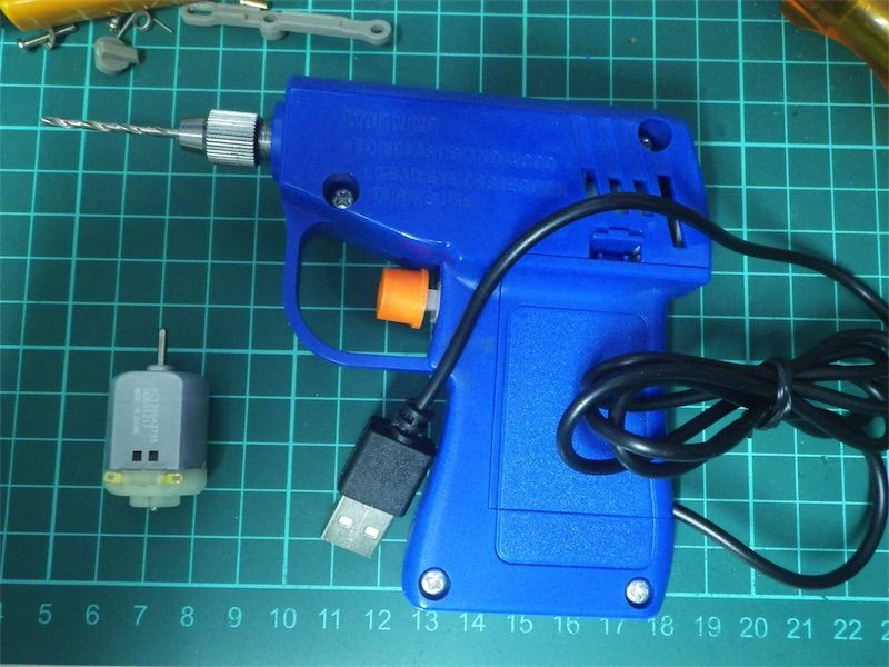 タミヤ クラフトツールシリーズの電動ハンディドリルを便利に使っているのだが、作り方が悪かったのか電池まわりの接触が悪く動かなかったり回りっぱなしだったりになっていた。この際USB電源対応に改造してしまおうか。