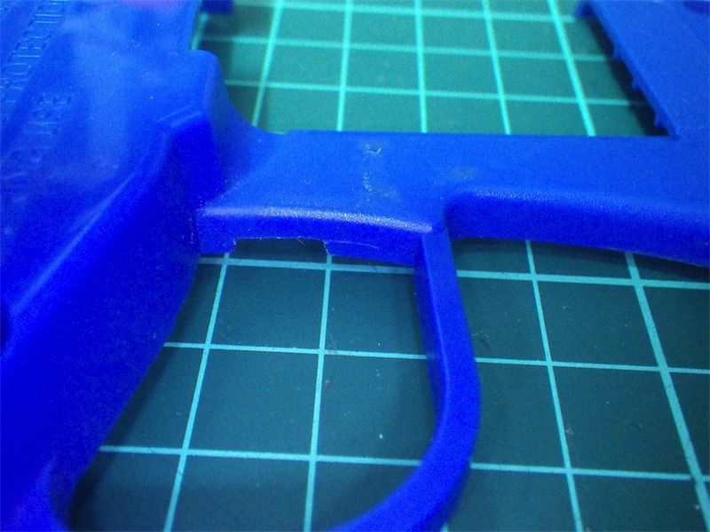 スイッチが当たる部分を加工。プラモデル部品なのでカッターナイフだけでも削ることができる。