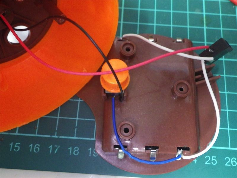 では組み込んでみる。スイッチ部分はもともとあった部品を外してUSB対応ファンで使われていたスイッチを流用。スイッチ動作はモーメンタリ(押したときだけ)からオルタネート(ON/OFF切り替え)になるけどいいでしょう。セメダインスーパーZで固定。