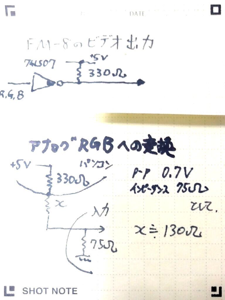 8ピン角型端子はディスプレイ側の形状で、パソコン側はほとんどがDIN 8P。すべての信号はTTLレベルだが、映像信号(R,G,B)はFM-8の例をみるとオープンコレクタの74LS07出力を330Ωで+5Vにプルアップした出力になっている。これをアナログRGBの信号入力、ピークで0.7Vになるよう電圧を変換する。インピーダンスを75Ωとして、デジタルRGBとアナログRGBをつなぐケーブルに直列に挿入する抵抗値は約130Ω。VSYNC/HSYNCはTTLレベルなのでそのまま接続してよい。