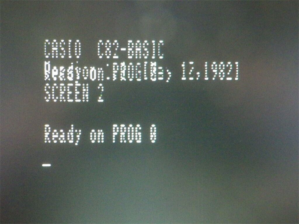 さて、CASIO FP-1100ではこのようにドットが欠けたように表示される。これは640x400表示を水平同期周波数15KHzで行う場合に縦の奇数ドットと偶数ドットを交互に出力するインターレース表示を行っているせいできちんと表示できない。日立ベーシックマスターレベル3もインターレース表示モードでは同様の結果。レベル3純正では長残光ディスプレイというものを使っていた。液晶ディスプレイでは直前のフレームが残像にならないのでこうなるようだ。