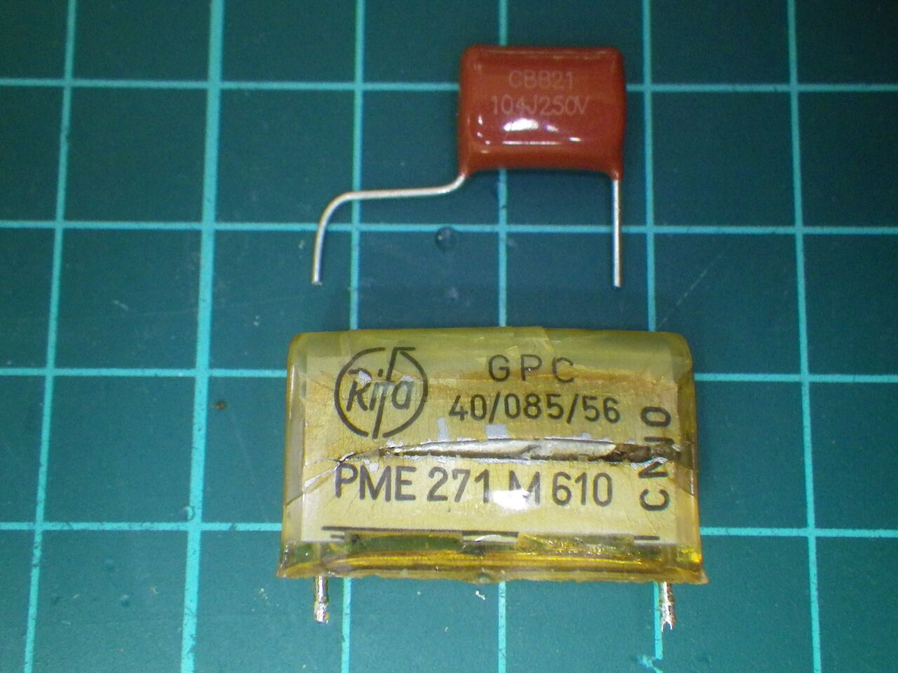 上は同等品の0.1μF 250V メタライズドフィルムコンデンサ。これと交換。