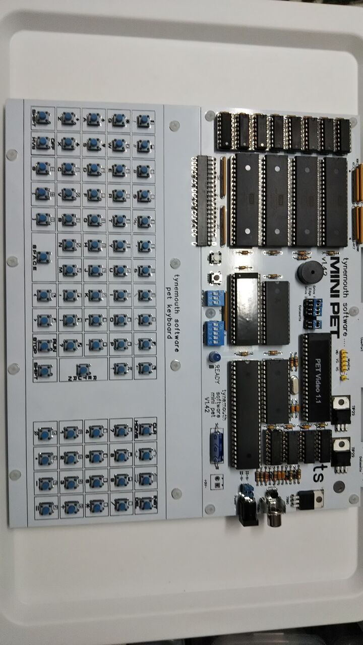 たのしみにしてたキットが届きましたよ。Mini PET v1.42。PET2001N相当のパソコン組み立てキット。KIT Aはキーボード基板付きで単体で動作。KIT BはPET2001のマザーボード置き替え用でデータセット(カセットレコーダ)と電源接続用の基板が別に付属している。