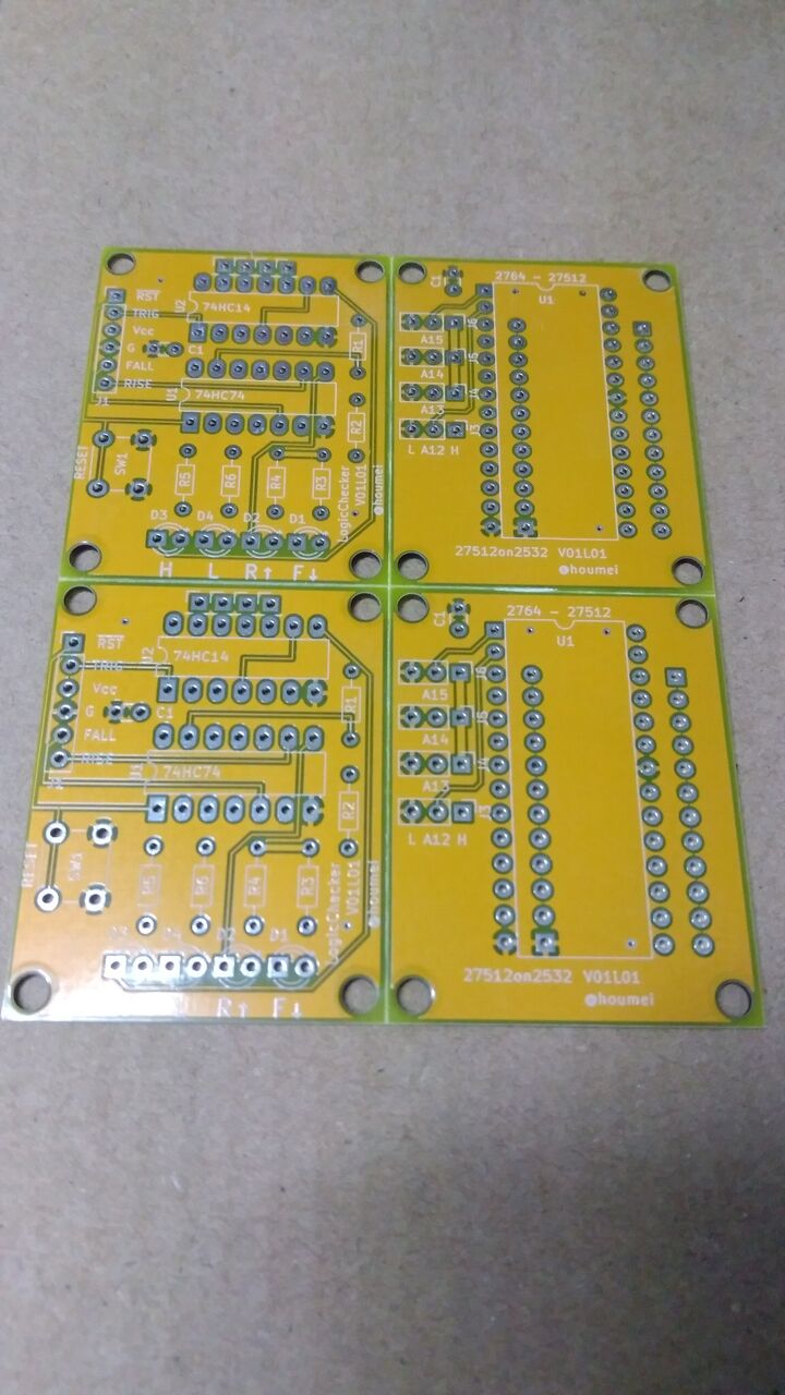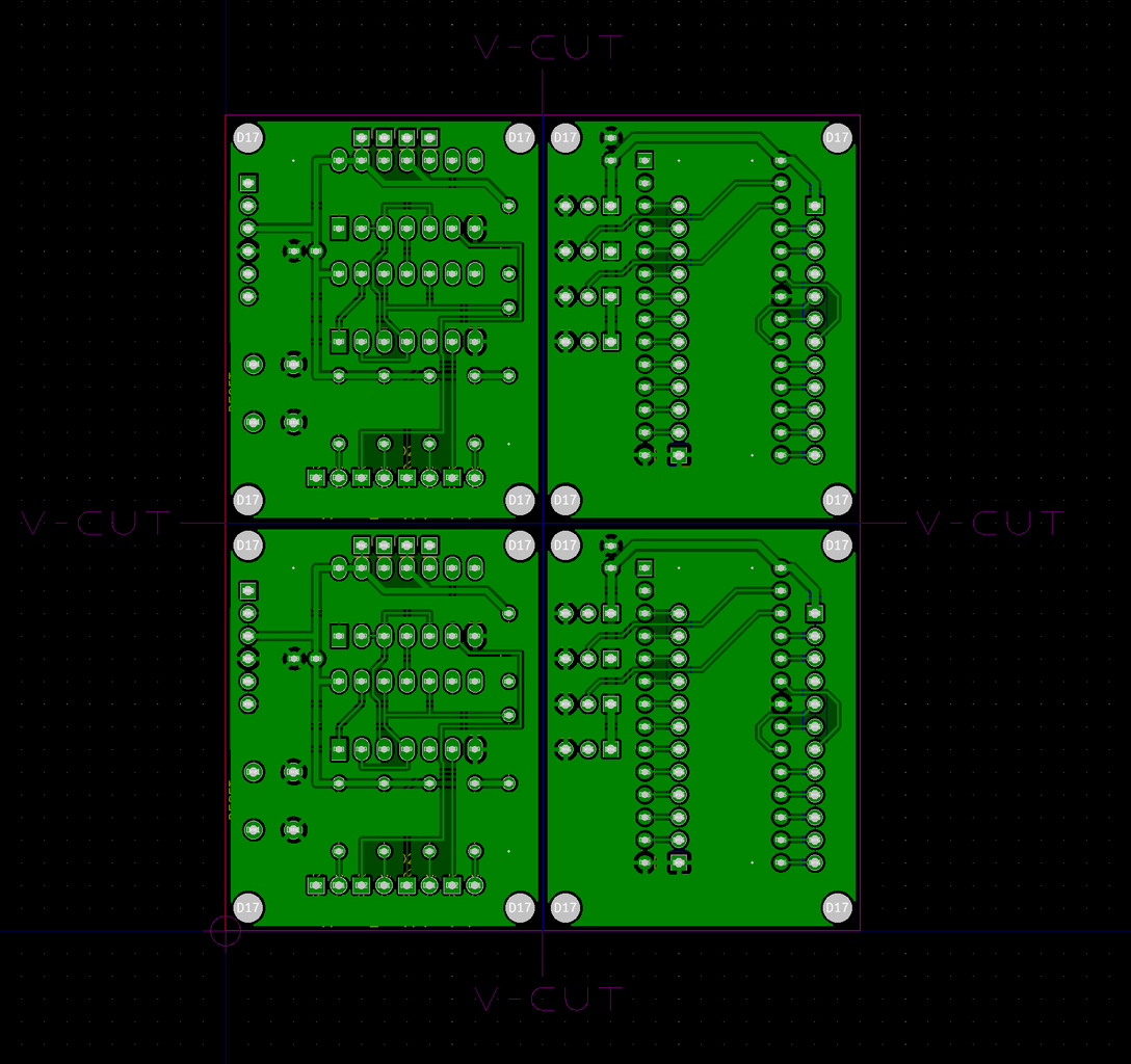 秋月電子のD基板サイズ(47mmx36mm)で二種設計した。これらを個別に発注せず100mm x 100mm以内にまとめて製造依頼するために面付けというのをやってみた。4枚分の面積は秋月電子のB基板サイズ(95x72mm)で、基板を4枚に分割するためのV-CUTを指示するとその部分に溝を掘ってくれる。ここから折ると目的の基板が得られる。