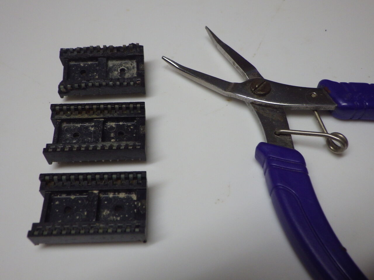 24ピンのICソケットは全部外したが残りの40Pソケットx2は猫が邪魔しにきたので中断。使っている小さなペンチは百円ショップで買ったものだが妙に使い勝手が良い。