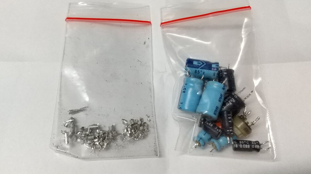 外した部品。ハンダ吸い取り器から出てくるハンダくずは作業中小さいビニール袋に入れている。