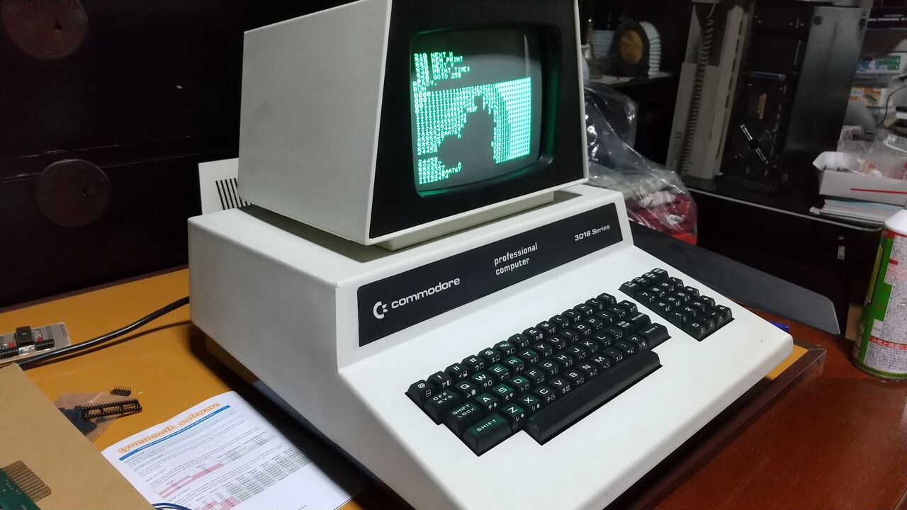 PET2001のCRT背面には輝度調整のつまみが出ている。このCBM3016は電源を入れても画面に何も表示しないことがあり、このつまみをグリグリ動かすと表示したり消えたりする。