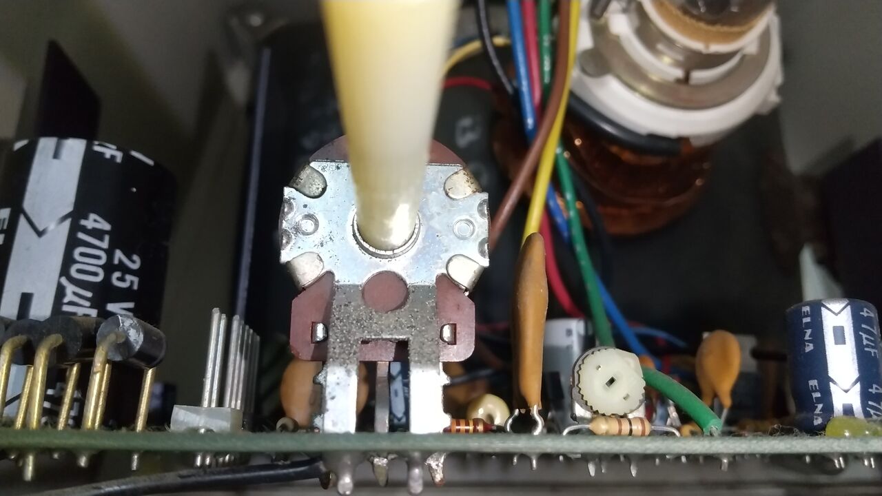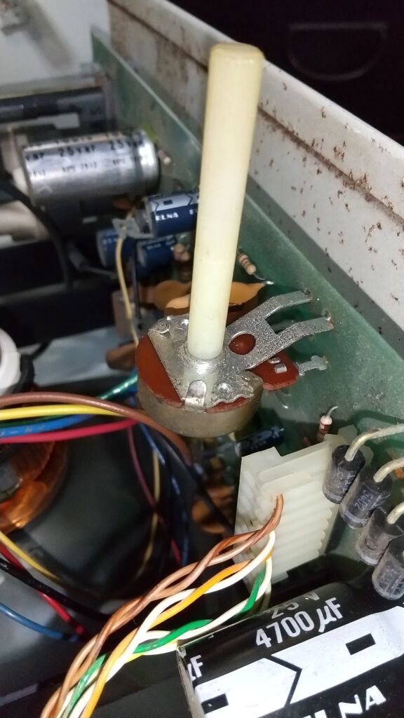 金属のツメ4つを起こして背面のカバーを外してみる。右側に見えるつまみの根本にあるのが摺動子で、これがカーボン抵抗に押し付けられている。