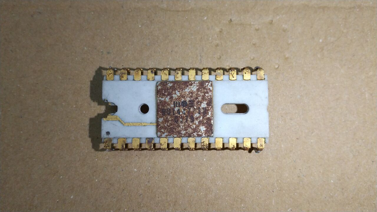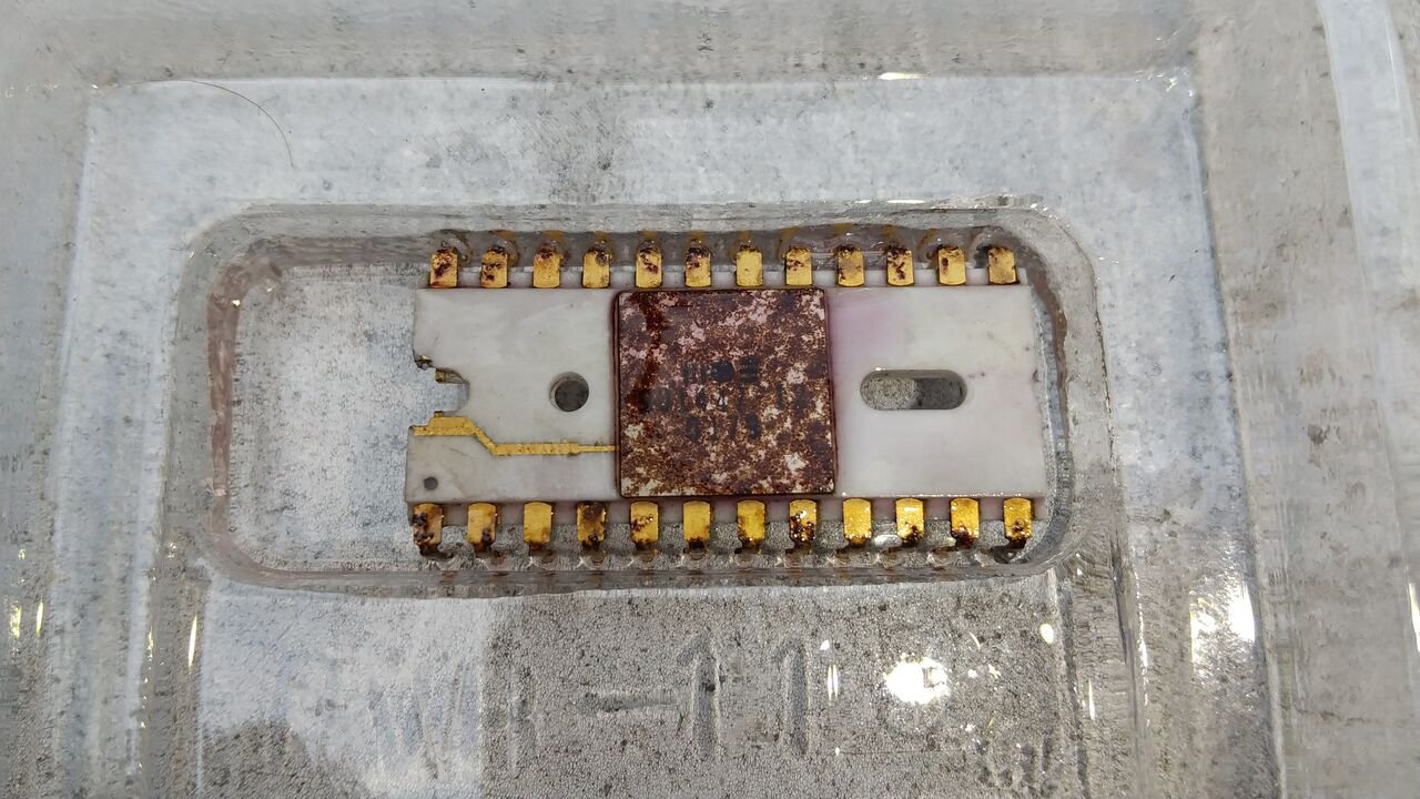 セラミックパッケージの金属部分の錆落としに関して有効。ただ、パッケージを封止しているこの金属の蓋の隙間から水分が侵入するかもしれない。このCGROMはデータを取り出した上で錆落としをやっているので観賞用ということで。