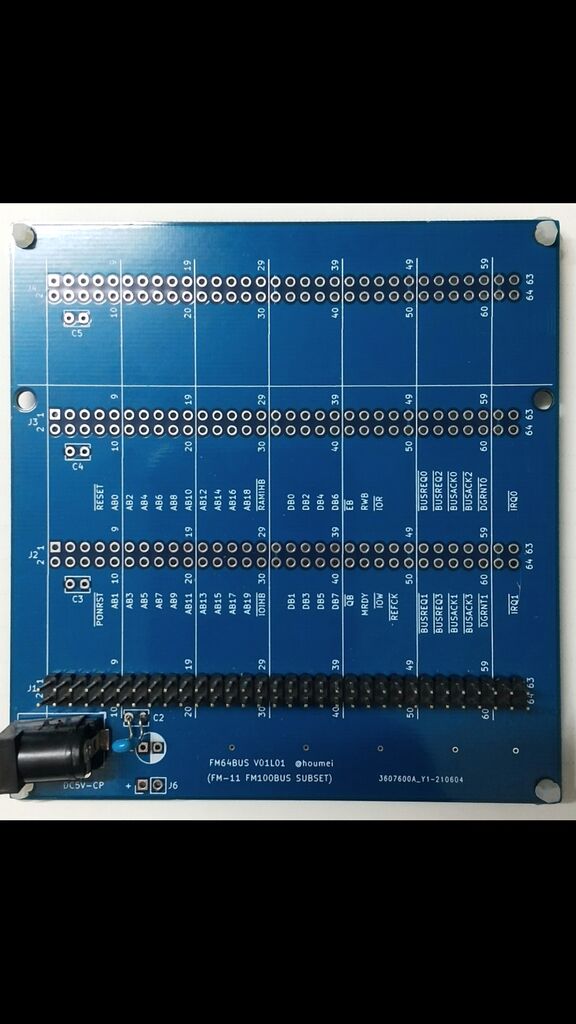 手配線にくじけてプリント基板を発注したのだけれども、それとほぼ同時に64ピン分のみ抜き出したFM64BUSボードを作ってみた。レイアウトに失敗してDCジャックやパスコンが取り付けたカードに干渉してしまうがこんな感じ。