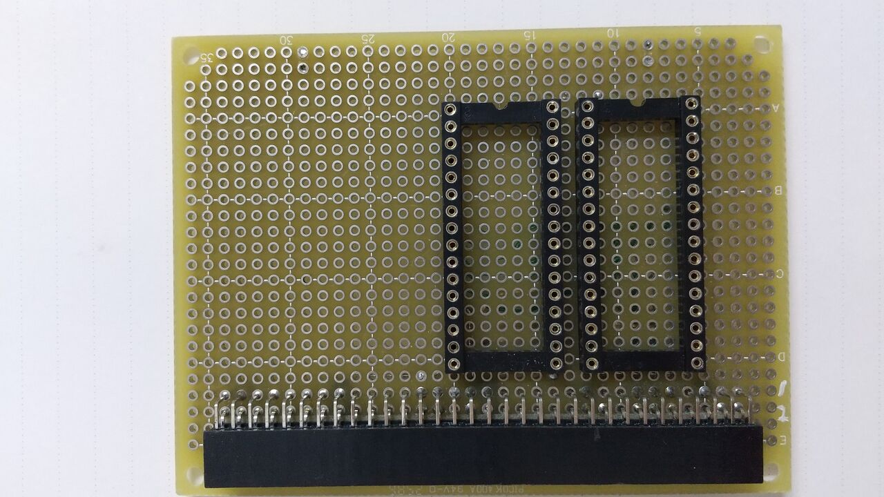 で、秋月B基板の長辺にはたまたま秋月電子で扱っているL型ピンソケット2x32(64P)がぴったり収まり、FM-11のバスを見るとメモリアクセスやI/Oに必要な信号がこの中にはいっている。ということで増設メモリカードを作りかけた。