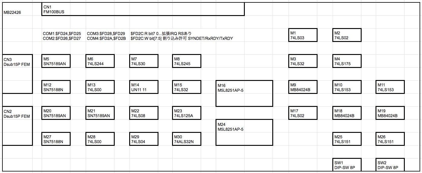FM-11の拡張カードにMB22426 増設RS232Cインターフェースカードというのがある。カードあたり2つのRS232Cインターフェースがあり、最大2枚、本体内蔵と合わせて5チャンネルまで用意できる。昔はパソコン通信のホストを構築するためによく使われたらしい。