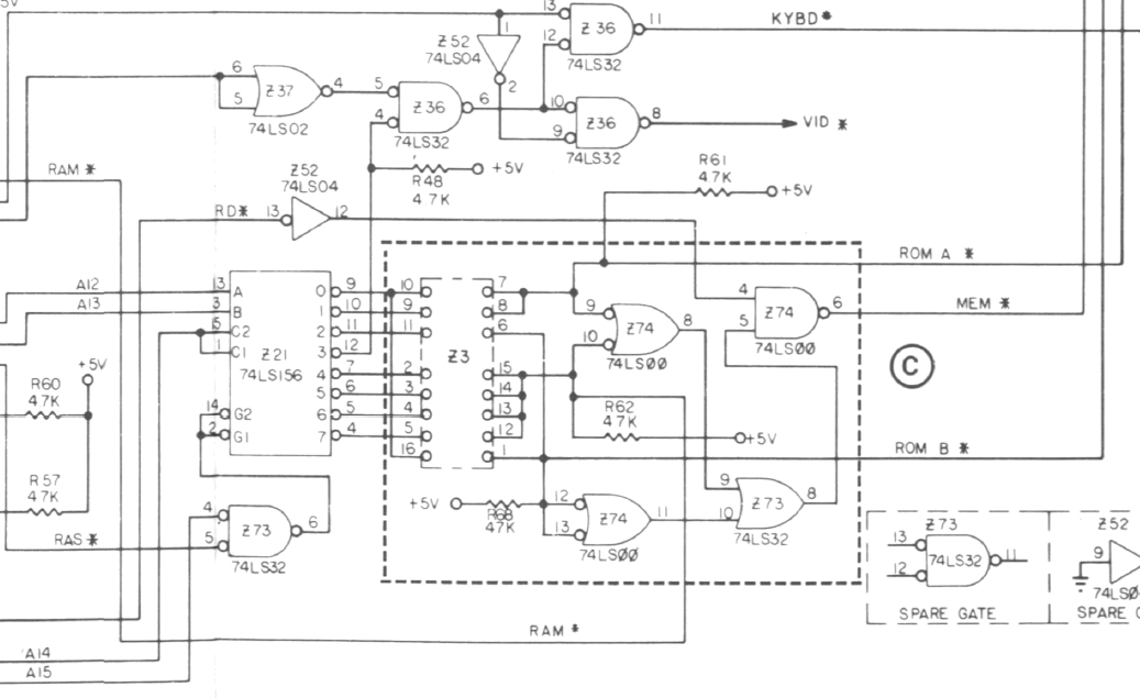 さて次はどこを見るか。アドレス線を疑ってみよう。ビデオ回路はLS93カウンタが生成する周期的なアドレスとZ80からのアドレスをLS157で切り替えてVRAMに送っている。