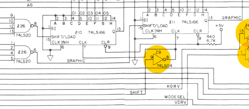 キャラクタやセミグラフィックスのデータはZ10,Z11のLS166でSHIFTクロック信号によりドット単位で出力される。このSHIFTクロック信号はZ9(LS04)で駆動される。元はZ43の出力で原発振の10.6445MHz(横64文字)またはその半分(横32文字)。
