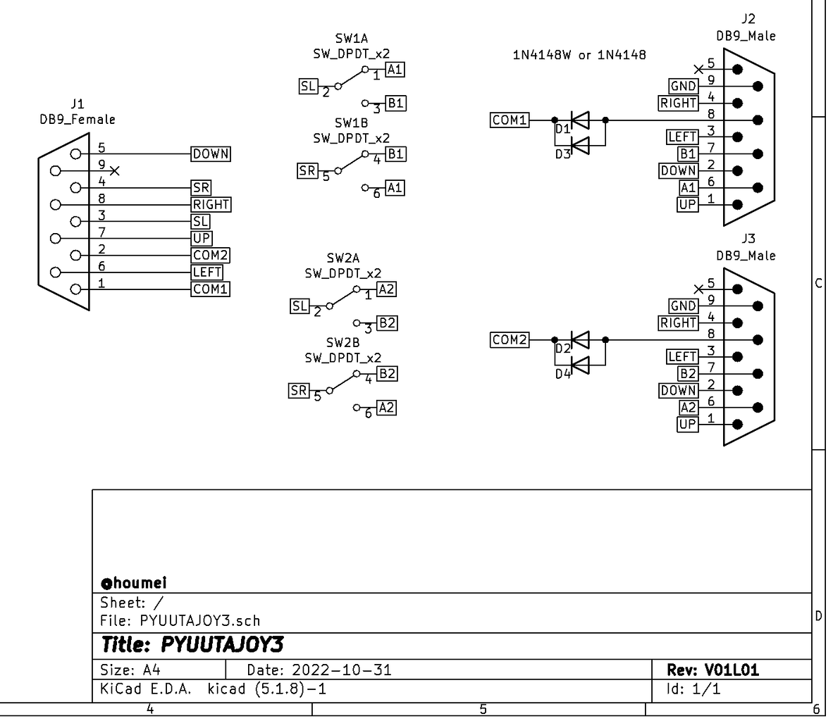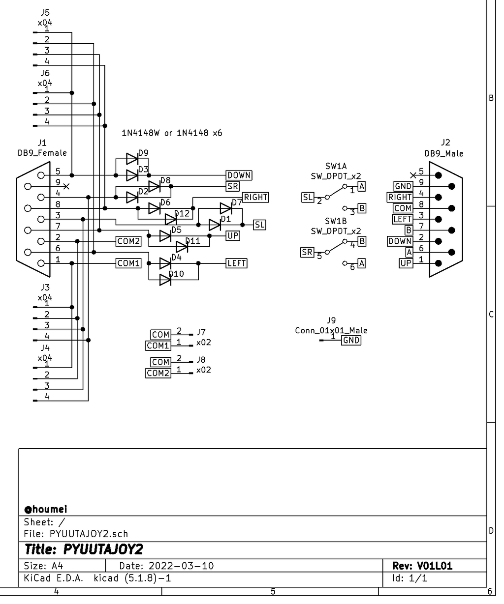 ぴゅう太のコントローラは6個のダイオードを内蔵しておりPYUUTAJOY2でも合計12個のダイオードを使用していた。が、回路図を見てみると減らせそうな感じがする。