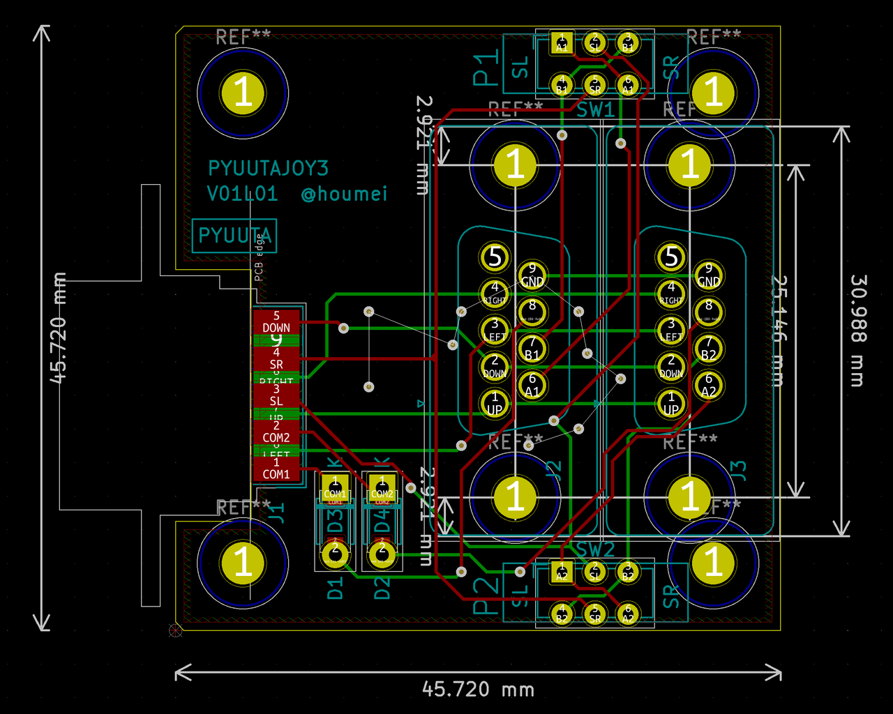 PYUUTAJOY2は基板1枚を1P/2P兼用の設計にして上下に合体させるしくみが自分でも気に入っているのですが、部品点数が多くなり組み立てるのが面倒でした。これを部品削減とコネクタを垂直に取り付けることにより同一面積で同じ機能を実現したのがPYUUTAJOY3です。