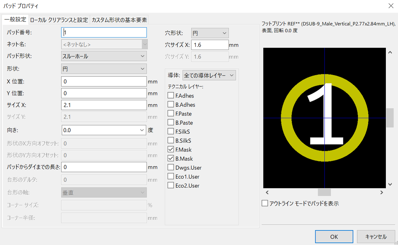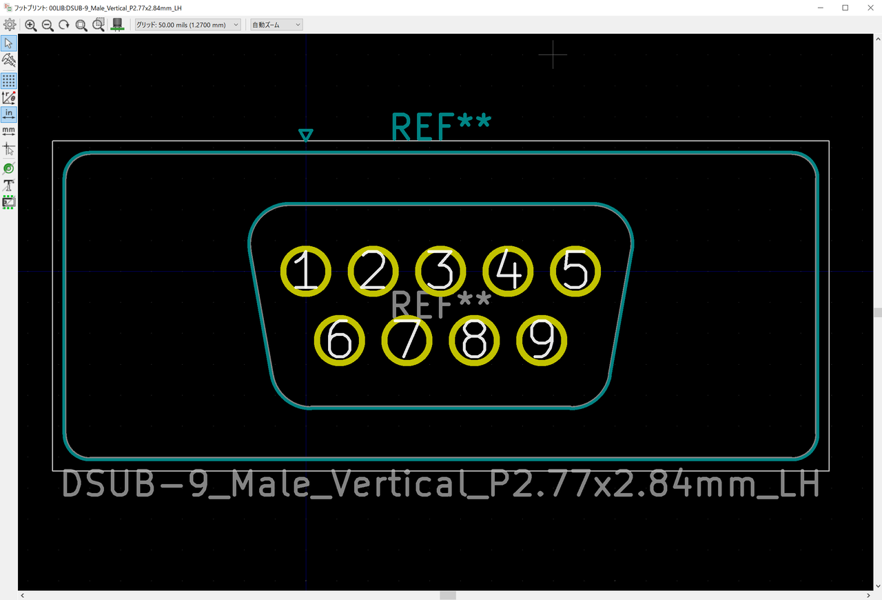 KiCad(5)にはDsubコネクタを垂直に取り付けるためのフットプリント DSUB-9_Male_Vertical_P2.77x2.84mm というのがありますがどうみても端子の穴が小さいので自前のフットプリントライブラリにコピーして編集。1番ピンの四角いパターンは円に変更し、デフォルトでぎりぎり端子間に配線が通るよう穴を拡大。