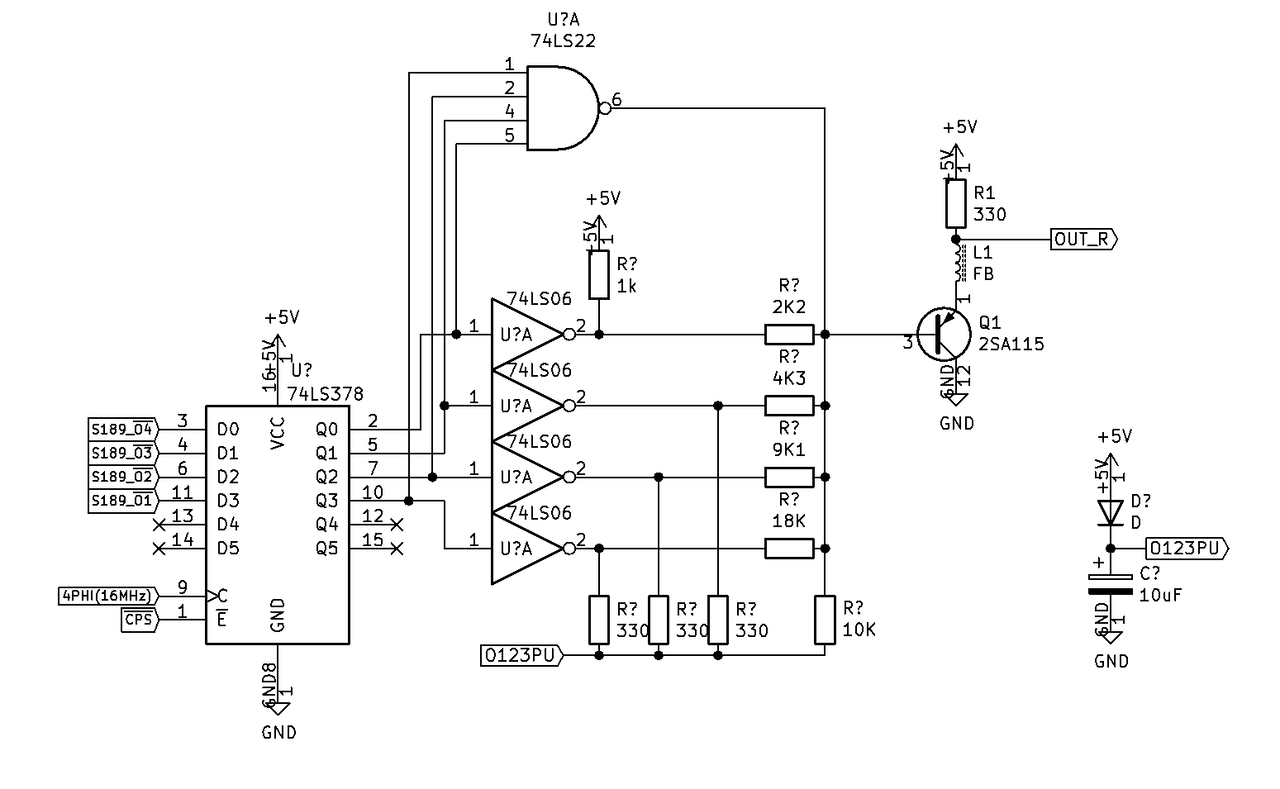 4つのオープンコレクタ7406で2K2/4K3/9K1/18Kを使って階調を作る。これはSMC-70のモノクロ出力回路とそっくり。MSBは1KΩでプルアップしているが、その他3bitは他のポイント(O123PU)でプルアップしている。なぜこのようにプルアップのポイントを分けているかは理解できていない。