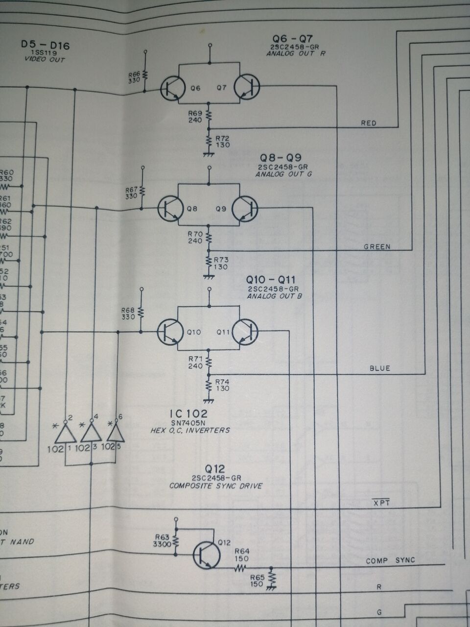ALS22によりR,G,B,Xがすべて0の場合は強制的に0Vにしている。これらの信号をPNPタイプのトランジスタで受けてエミッタフォロワで出力。この回路がO123PU生成部を除いてR,G,Bの3セット分ある。