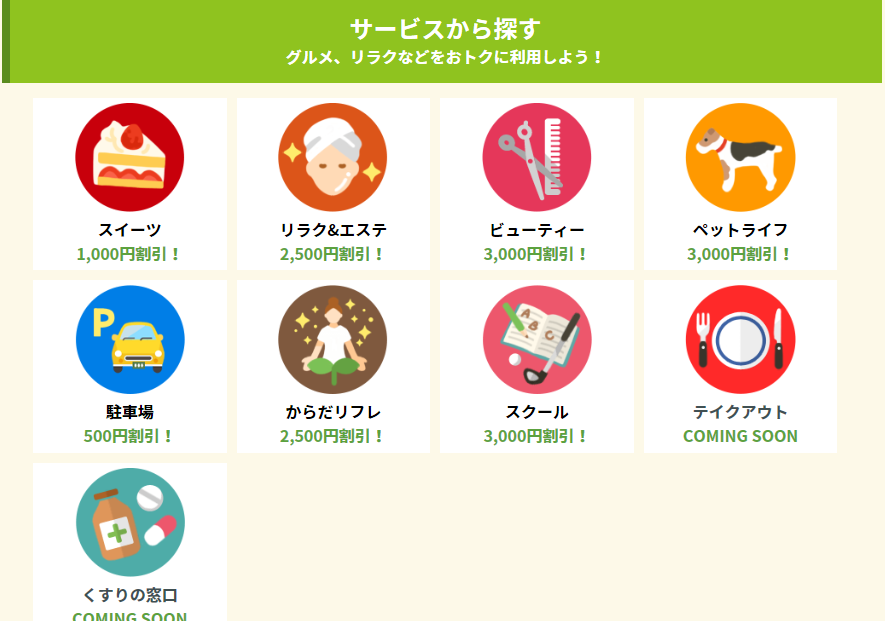 なんと言ってもポイントに年利1%の利息がつくのが魅力的です。また、お買い物ではポイント還元5倍のセールや100%還元のサービス案件などお得な案件も多いです。さらに、美容サロンやスイーツ、エステなどの利用で実質無料で体験できることもあり、女性に魅力的な案件も揃っています。