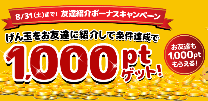 げん玉では、現在、8月31日までの期間限定で、1000P(¥100)プレゼントキャンペーンを行っています。