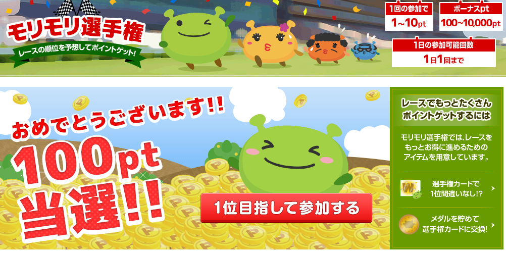 毎日、1回、クリック応募するだけでいい「モリモリ選手権」では、必ず1P~1万Pがゲット出来ます。