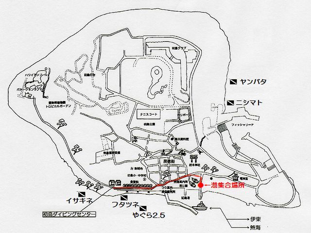 ●港集合時間の5分前までに器材を車両に載せてもらいダイビングセンターから港へ徒歩で移動して頂きます(4~5分・下記地図をご参照下さい)。器材は車で港までお運びいたします。