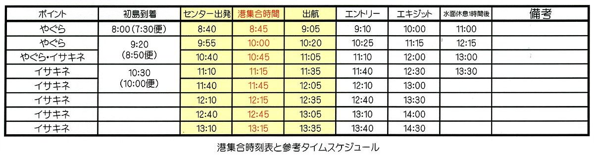 ●港集合時間、及び出航時間は定刻制です。ご予約に関しましては別紙予約シートにて、下記の港集合時刻表と参考タイムスケジュールをご参照頂き、ご希望の『港集合時間』もご記入の上、なるべく前日16:00までにFAXにてお願い致します(お電話でも可)。それ以降のご予約に関しましては承ることができない可能性がありますので、予めご了承下さい。ご希望の時間にボートをご用意できない場合はご予約のご連絡時、もしくは直後にこちらから別時間のご提案等のご案内をさせて頂きます。