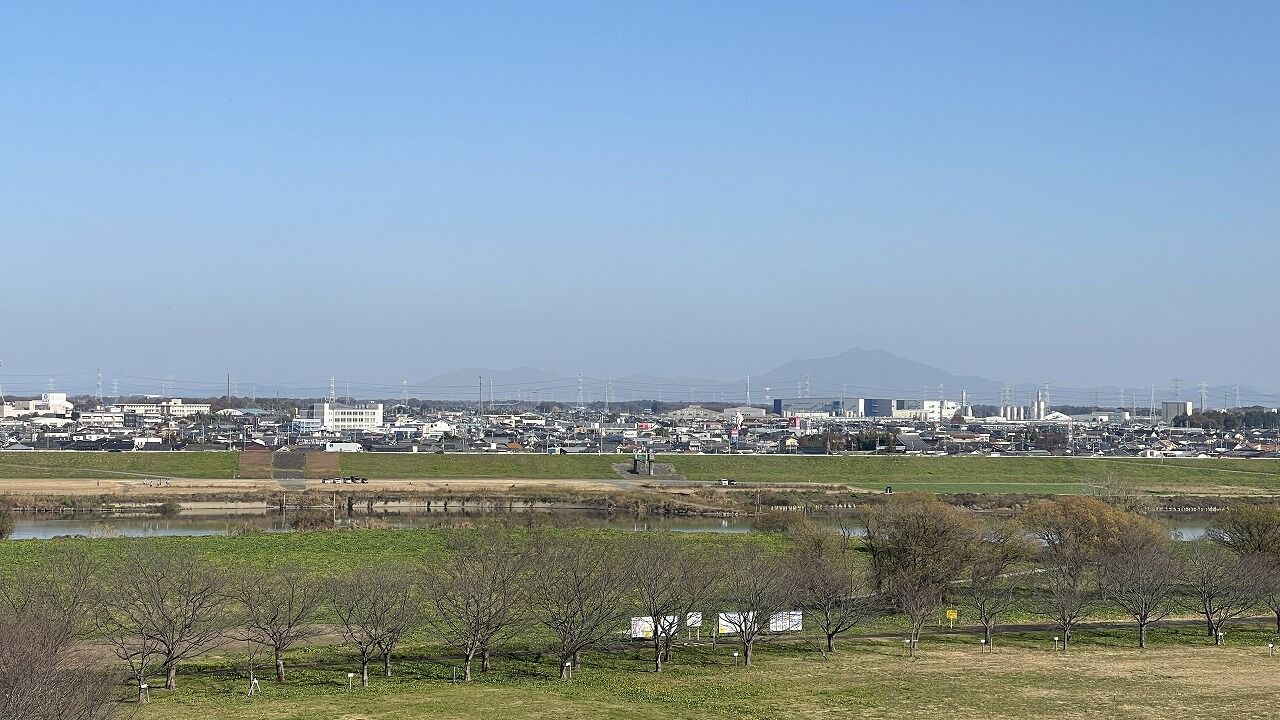 まずは4階部分の展望室から。北東側の利根川の向こうは境町(茨城県)。その奥側には筑波山が見えています。境町は手前側関宿(千葉県)より栄えているようですね。まあ江戸期にも川湊として栄えた場所でしたが。