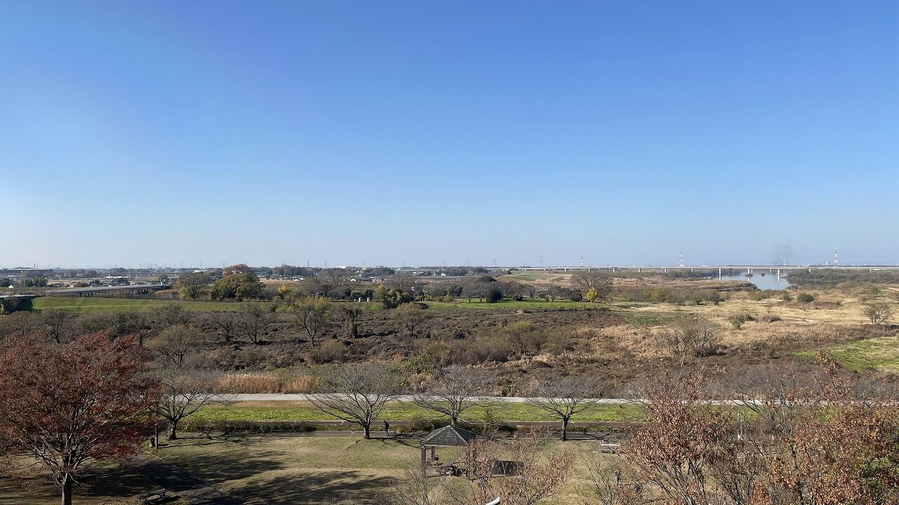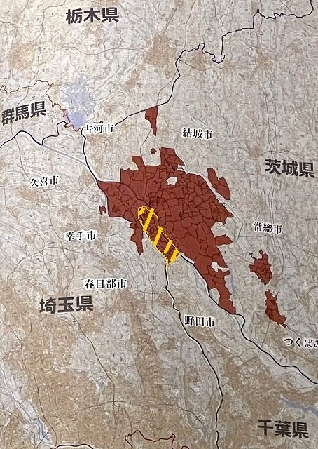 北西側。右側の利根川と左の江戸川にはさまれた三角地帯からは実は茨城県五霞町。千葉県は博物館の足元までということになります。
