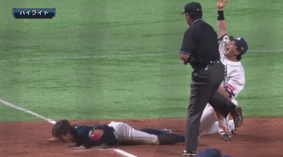 成功すればリクエストで試合終了という珍しいケースだったが、判定は変わらずプレー再開。仕切り直しで中島に左前打を許し、ピンチ到来かと思われたが、三塁を狙った小田をレフト中村晃が好返球で刺して試合終了。サード松田宣が本塁打後の「熱男」パフォーマンスよろしく、その場で右拳を突き上げた。