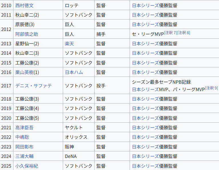 まぁ前の3人は選手時代にも正力松太郎賞受賞していて、監督になってから複数回受賞とかいう化け物ぞろいだが。(ほかに3回以上受賞したのは原辰徳氏のみ)