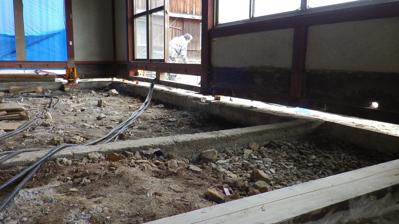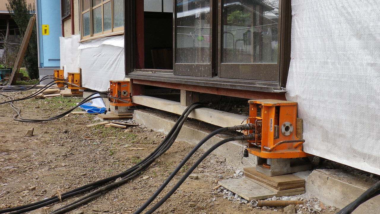 上記の写真は、油圧ジャッキにより建物全体を上げてる所です。