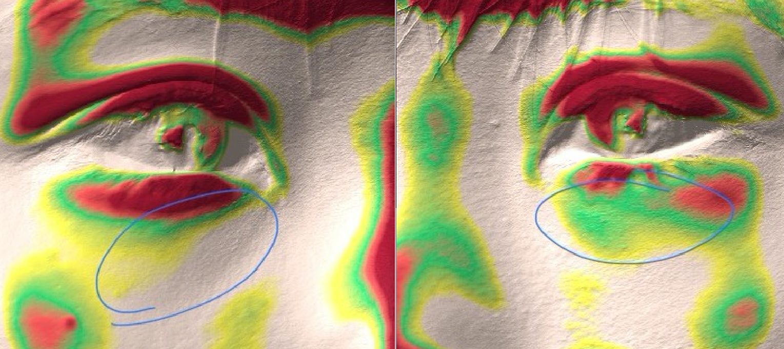 膨らみがある部分は赤く写ります。