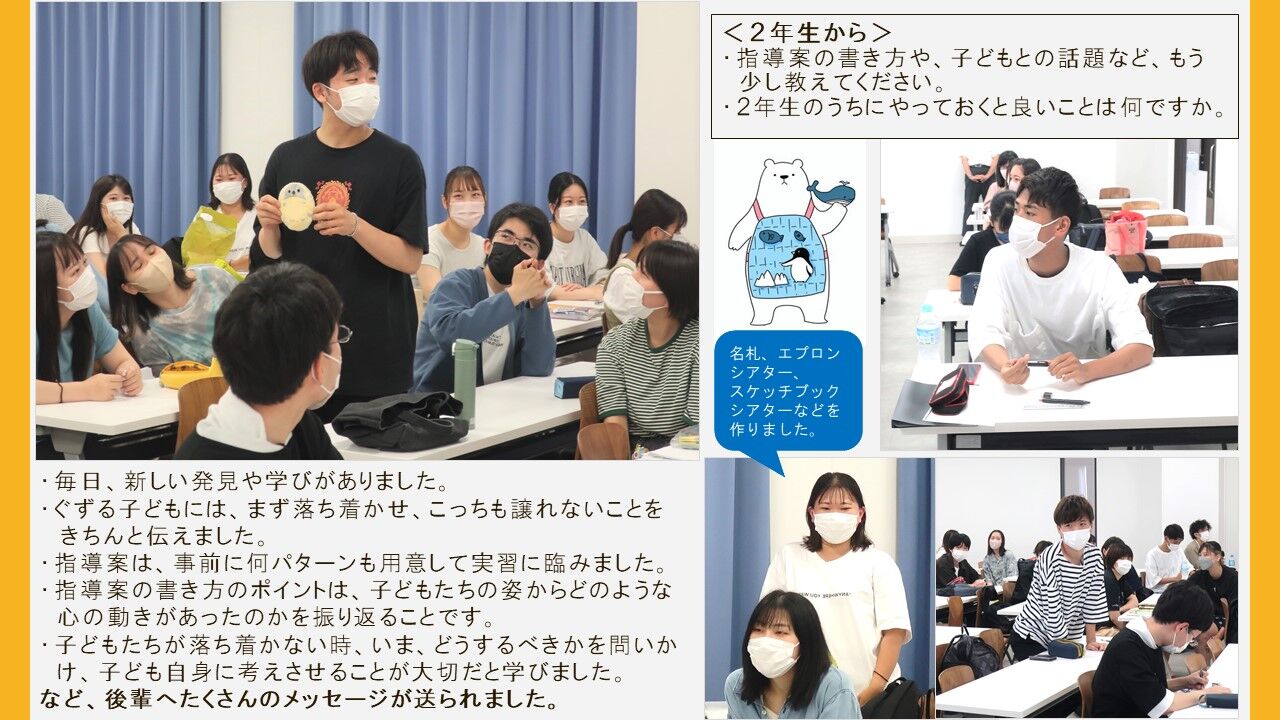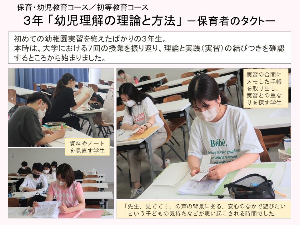 6月の2週間、保育・幼児教育コースおよび初等教育コースの3年生は、初めての幼稚園実習に臨みました。たくさんの学びと課題を持ち帰ってきましたが、これが今後の保育所や福祉施設実習、教育実習で活かされることを願ってやみません。ファイト!3年生!!!