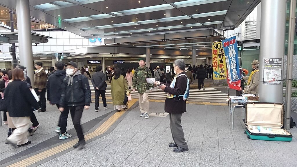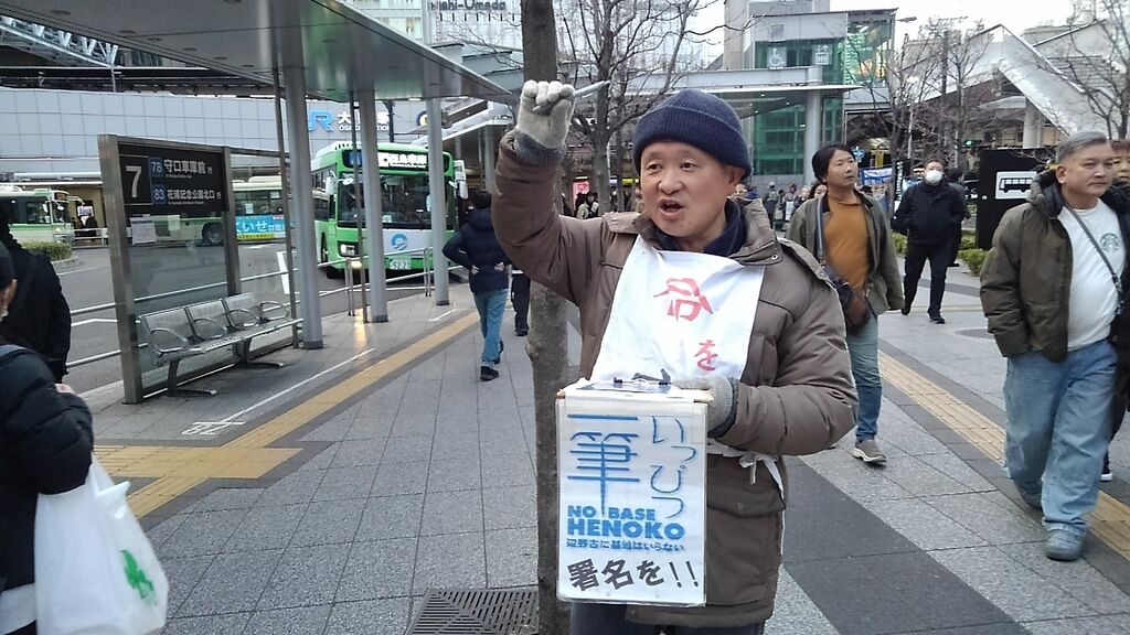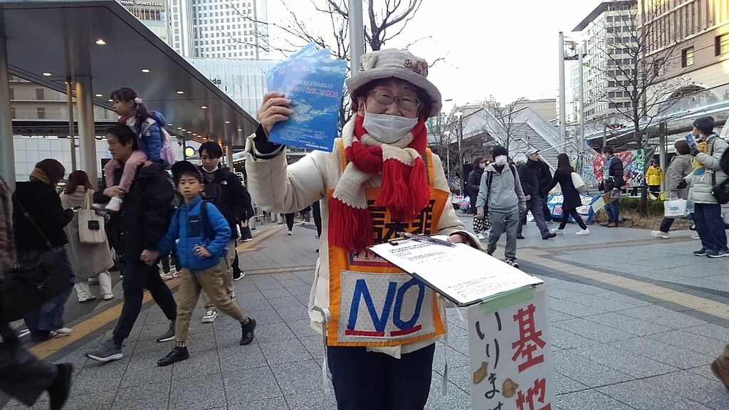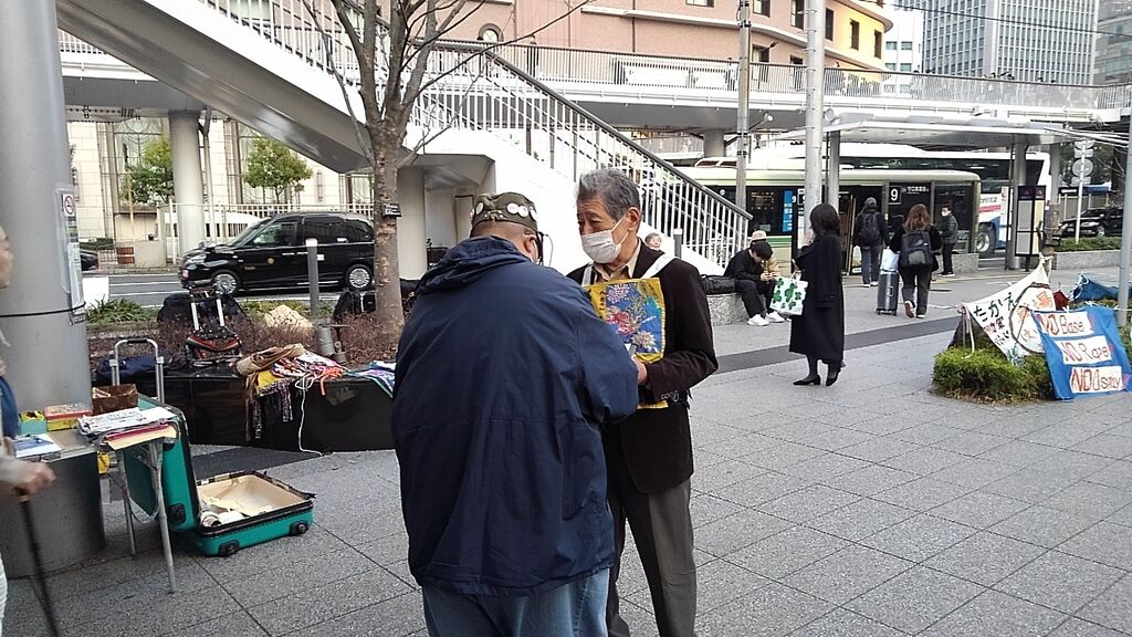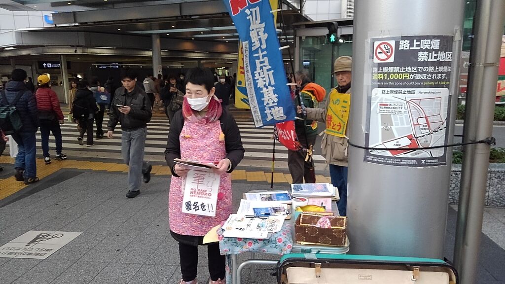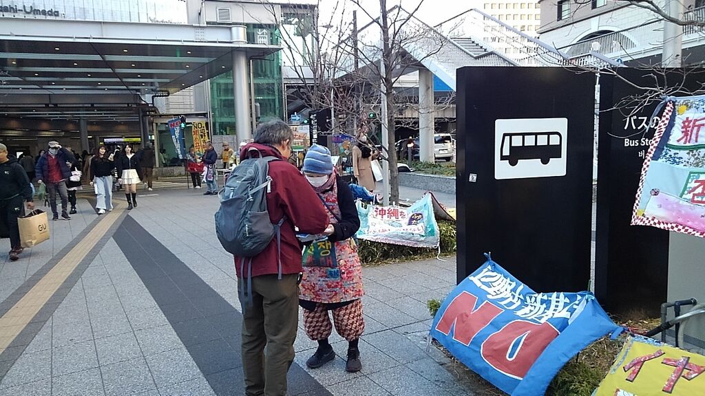 この日は比較的暖かく、衆議院解散総選挙や大阪での府・市長ダブル選挙の報道もあり、道行く人も政治に関心を寄せているのか、署名の際に沖縄に限らず高市政権や維新に対する批判の声が多くありました。尼崎で三線を習っているという方は辺野古新基地にも関心を寄せていますとおっしゃっていました。