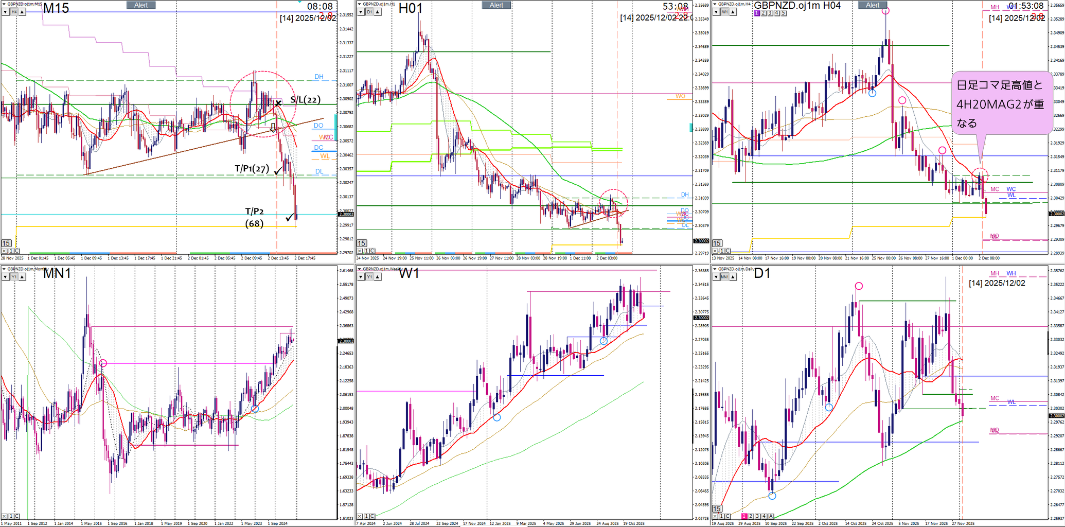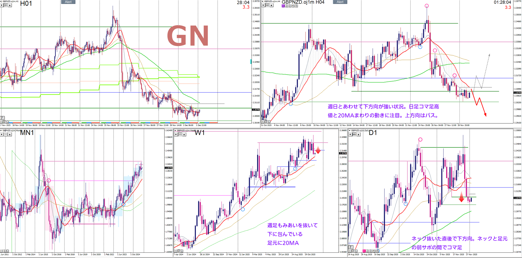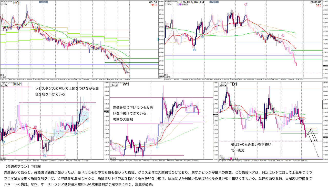 サブでEURAUDをあげておきましたが、こちらは①戻さない疑惑②戻しても4時間が電車道過ぎて引っ掛かるところがない、ので、かなり派手なプライスアクションつけてくれないと手を出しづらい。ゆるく見て行く感じになりそうです。