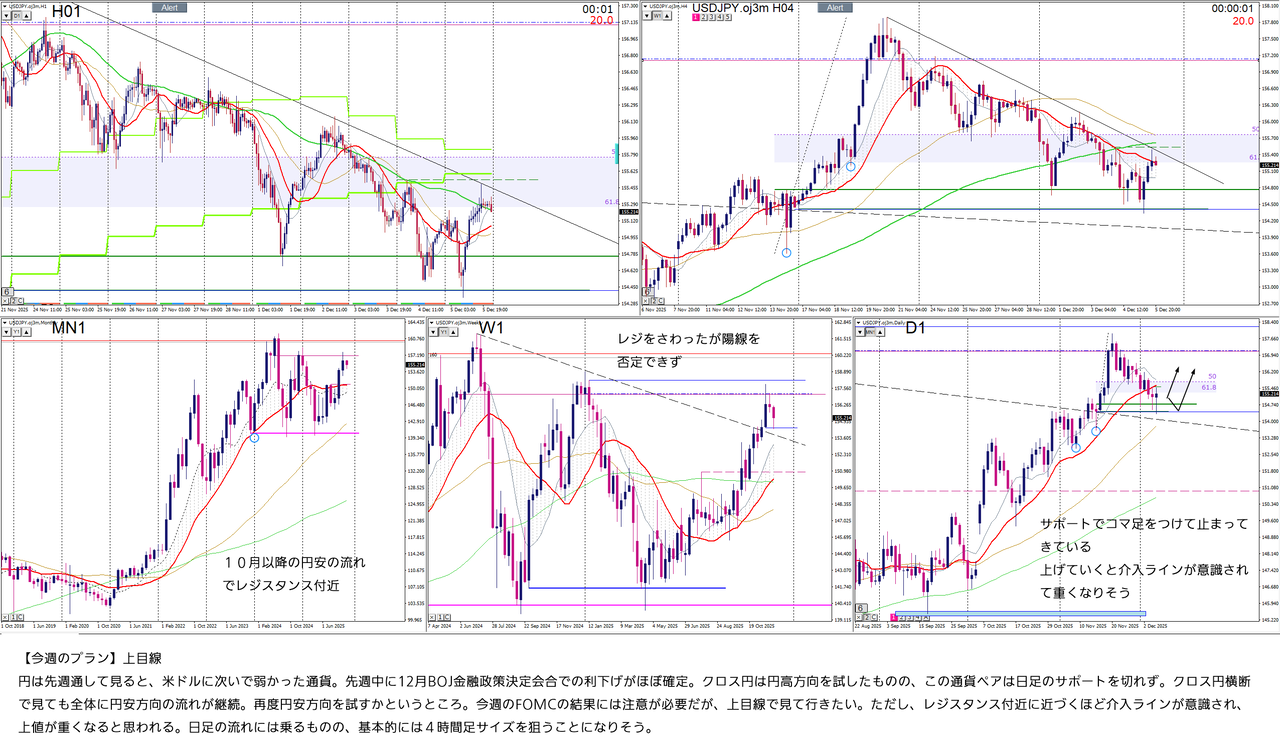 今週はドル円を見て行こうと思います。上に書いたように、来週のBOJで利上げ確実報道があっても円安の流れは切れていない印象。注意しておかないといけないのは2点。